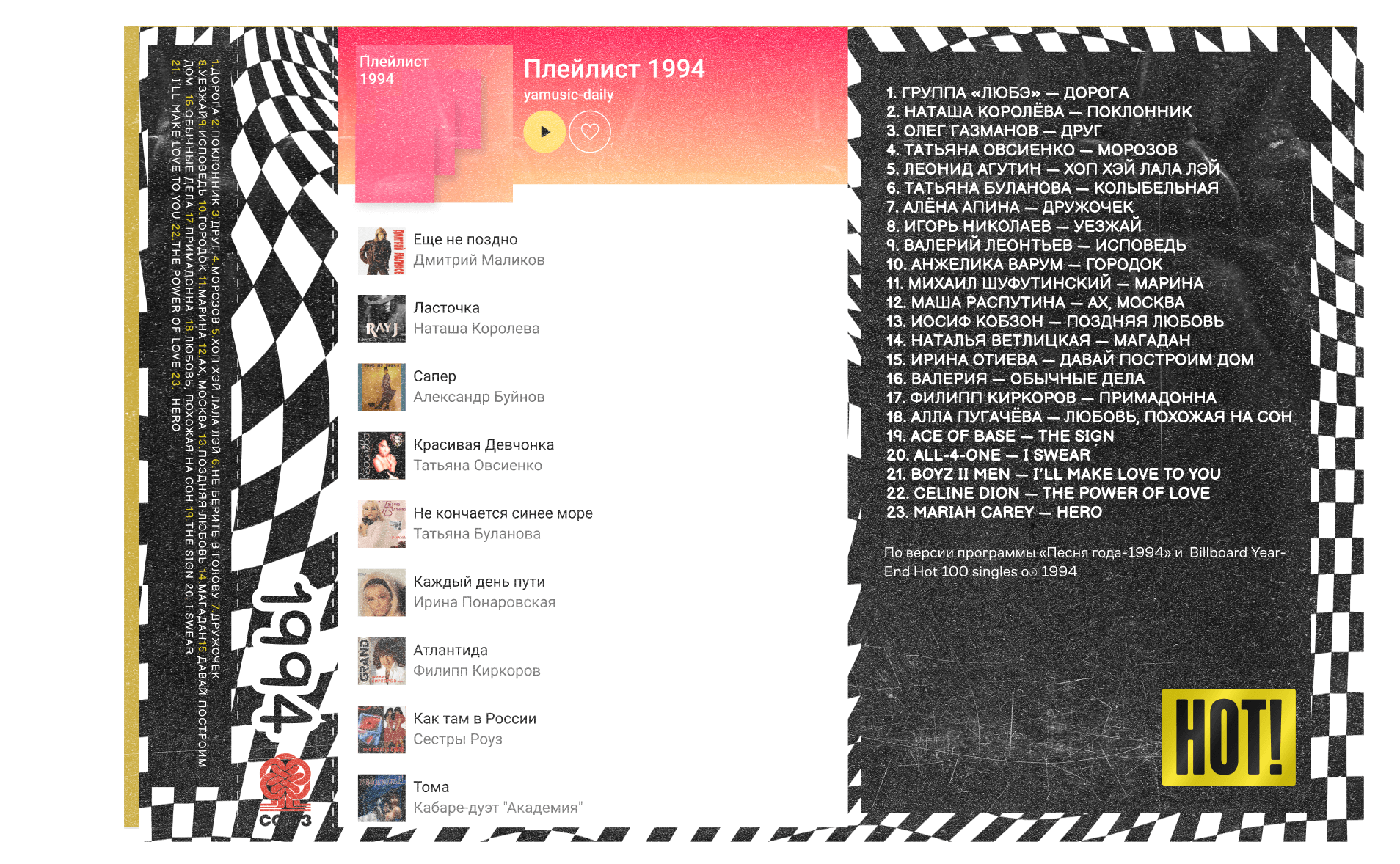 Шведская группа…... Ace of Base увидела знак, и это открыло им глаза. По крайней мере, так они поют в песне The Sign, которая становится мировым хитом и занимает первые места в чартах Австралии, Германии, Израиля и США. The Sign включают в список «100 лучших хитов всех времён». Альбом расходится в США тиражом в 23 млн дисков и попадает в Книгу рекордов Гиннесса как «самый кассовый дебютный альбом». «Ля-ля-фа!» — отвечает им на это …...Анжелика Варум. В России продолжают заслушиваться песнями из её альбома: помимо «Ля-ля-фа», там ещё два хита — «Городок» и «Художник, что рисует дождь». …...А Наталья Ветлицкая, опережая на 15 лет Васю Обломова, поёт песню про Магадан.