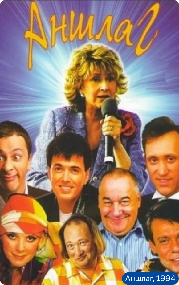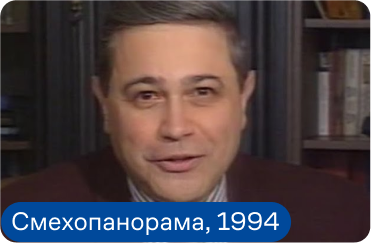 ….. «Смехопанорама» ….. и «Аншлаг» — вот новый русский юмор. «Здравствуйте, дорогие мои!» — начинает каждую передачу …...Регина Дубовицкая и заливается смехом будущих Бивиса и Баттхеда. Обе программы становятся для комиков трамплином в шоу-бизнес и делают их кумирами. А главного адепта бани Михаила Евдокимова («Морда красная такая!») — ещё и губернатором Алтайского края.