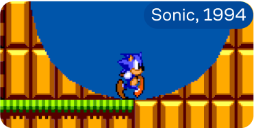 «Сега» считается более престижной: она дороже и мощнее, процессор целых 16 бит — значит и графика ого-го! На культовую Super Mario Bros от «Денди» «Сега» отвечает своей главной игрой — .....Sonic the Hedgehog. Синий антропоморфный ёж сражается против главного врага — доктора Эггмана, собирает золотые кольца, быстро бегает и сворачивается в шар во время прыжка. Главная боль геймеров — сохраняться в большинстве игр по-прежнему нельзя.