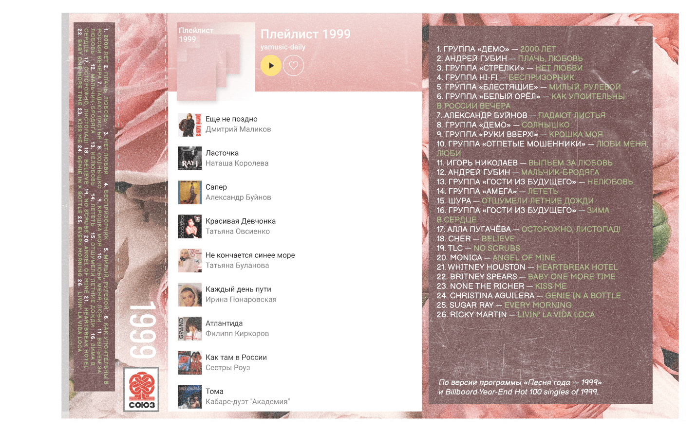 На российской поп-сцене расцвет танцевальной музыки. Главные дебюты года — группы ...... «Демо» и...... «Вирус» — почти неотличимы. Первая поёт про солнышко в руках, вторая уговаривает поднять ручки и танцевать. Без этих хитов не обходится ни одна дискотека. На западе в это же время выходит дебютный альбом...... Бритни Спирс — Baby One More Time. Его продадут тиражом 30 млн копий. Бритни назовут «Самым одарённым поп-феноменом», а журнал Rolling Stone поставит её на обложку.