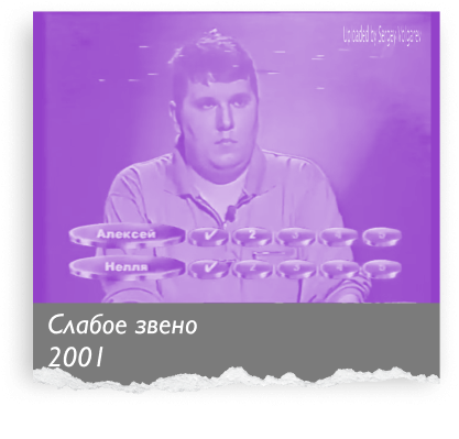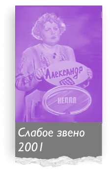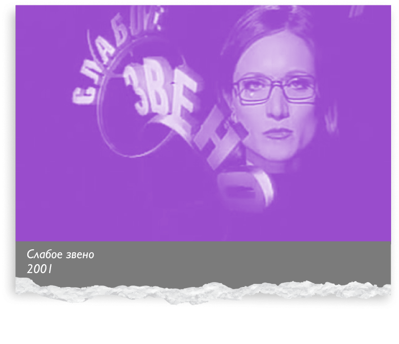 «Кого команда удалит как больной зуб? Кого сегодня дома выпорют за нерадивость?» — в эфир выходит передача «Слабое звено», где с игроками не церемонятся. Шоу сломало рамки привычной викторины. Если раньше в ней побеждали самые умные, а к соперникам относились с уважением, то в студии «Слабого звена» всё наоборот. Здесь игроки голосуют друг против друга, выгоняя самых сильных. А напоследок Мария Киселёва уничтожает бедолаг своими язвительными комментариями. От коронной фразы «Вы самое слабое звено, прощайте» бросает в дрожь не только участников, но и зрителей.