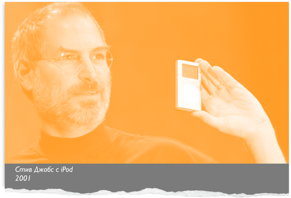«1000 песен у вас в кармане» — слоган Стива Джобса для плеера нового поколения. Apple выпускает iPod. Жёсткий диск в 5 Гб вмещает те самые 1000 песен в формате mp3. Маленький гаджет, похожий на пульт от кондиционера, устроит революцию на аудиорынке, сделав его наконец легальным. iPod разойдётся продажами более 100 млн экземпляров и покажет всему миру, какой должна быть портативная музыка.