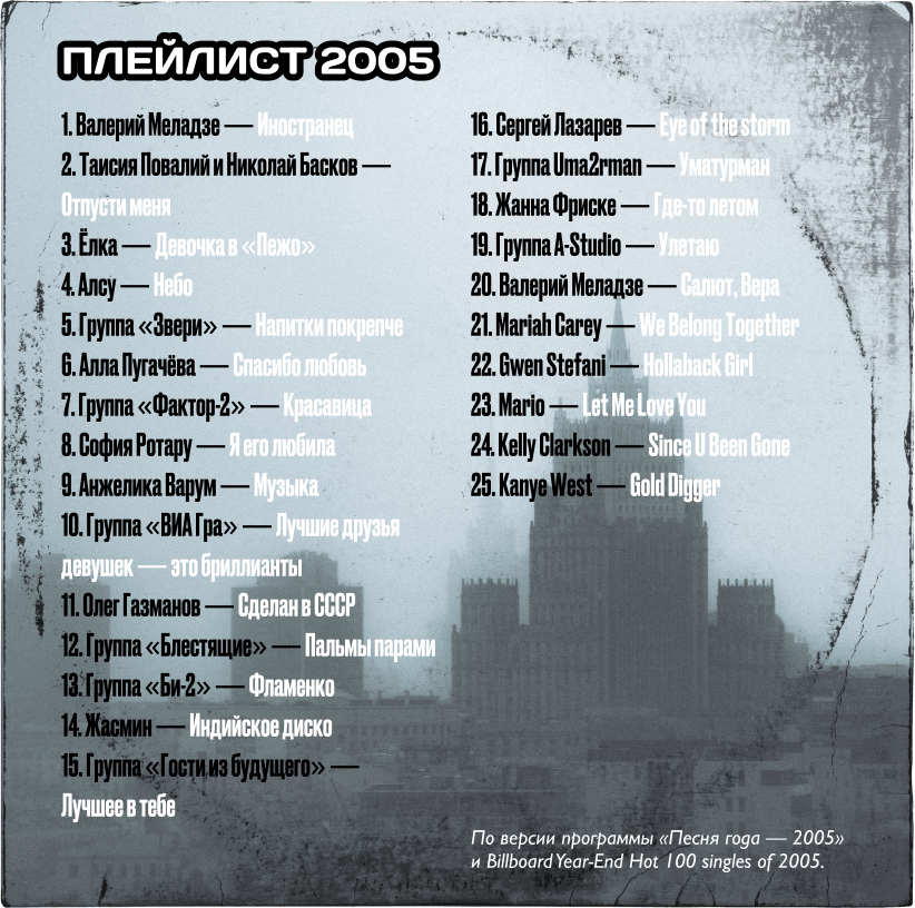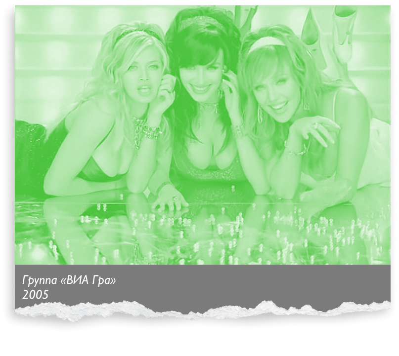 Первая песня Ёлки «Девочка в маленьком Пежо» — символ расцвета 2000-х. Судите сами: миленькая машинка, звонки по мобильному, голову качают ритмы R&B. Новая музыка — для новой эпохи! Лучшая, по версии Муз-ТВ, поп-группа 2005 года «ВИА Гра» тоже воспевает гламур: «Лучшие друзья девушек — это бриллианты». Под конец года золотой состав распадается: из проекта уходят Надежда Грановская и Вера Брежнева. С тех пор все будут говорить, что «„ВИА Гра” уже не та!».